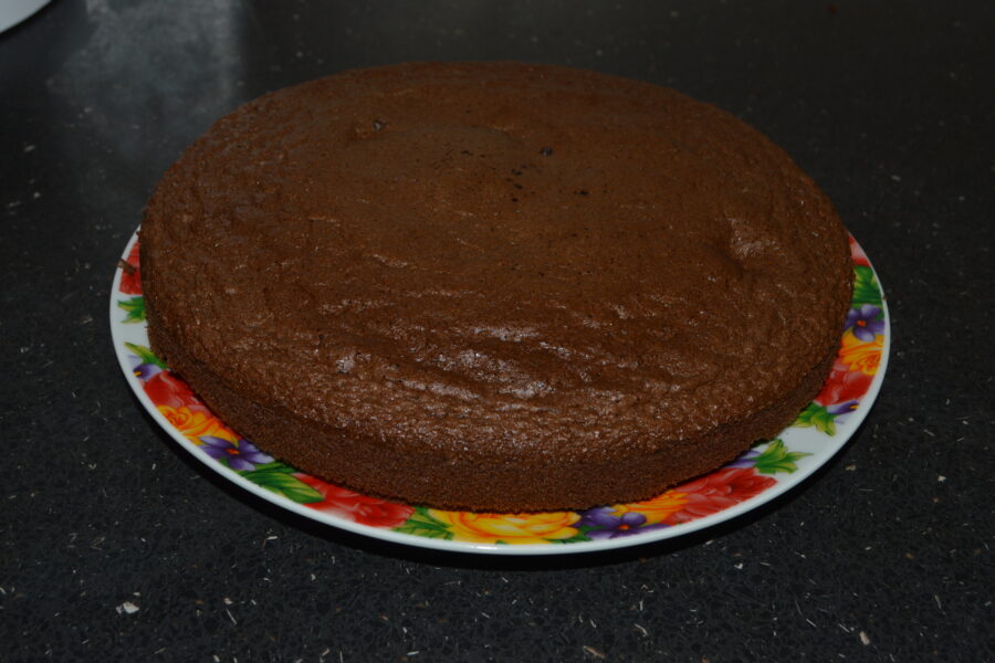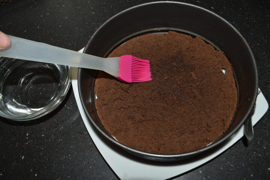 - Taiati pandispanul in 3 parti egale. Puneti prima bucata, si ungeti-o cu o perie de bucatarie, cu sirop. (Siropul este din 200 ml apa+1 lingurita de zahar.)