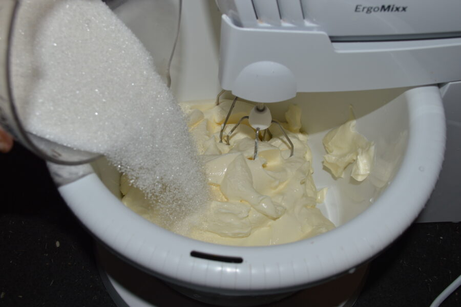 - Intre timp, cat pandispanul se raceste, puteti pregati crema. Puneti kilogramul de smantana in castron, si adaugati cele 170 de grame de zahar. Mixati intii un minut la viteza mica, apoi dati viteza la maxim.