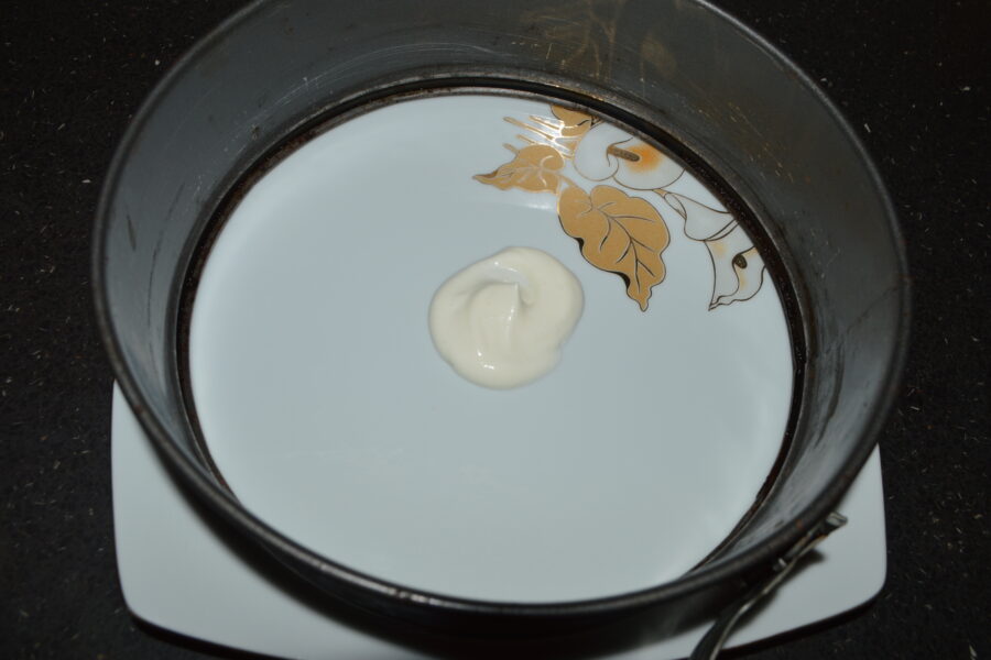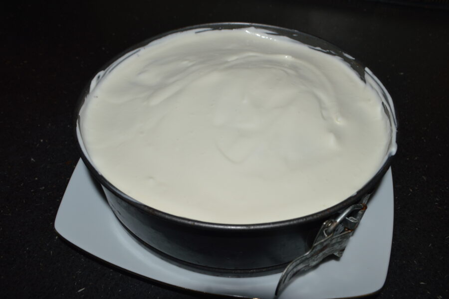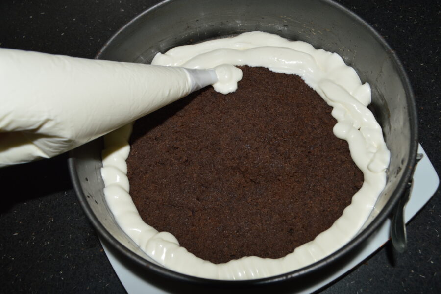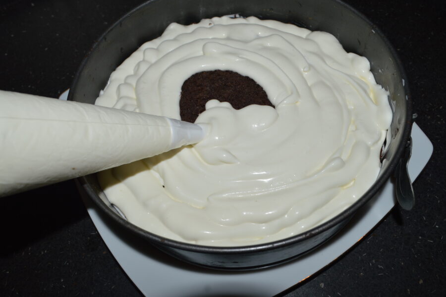 - Incepeti a ansambla tortul. Pe o farfurie sau pe un platou, puneti la mijloc putina crema, pentru ca tortul sa se fixeze bine. Folositi peretii de la forma detasabila, pentru ca tortul sa fie cat mai rotund si uniform.
