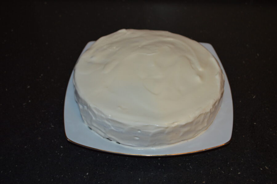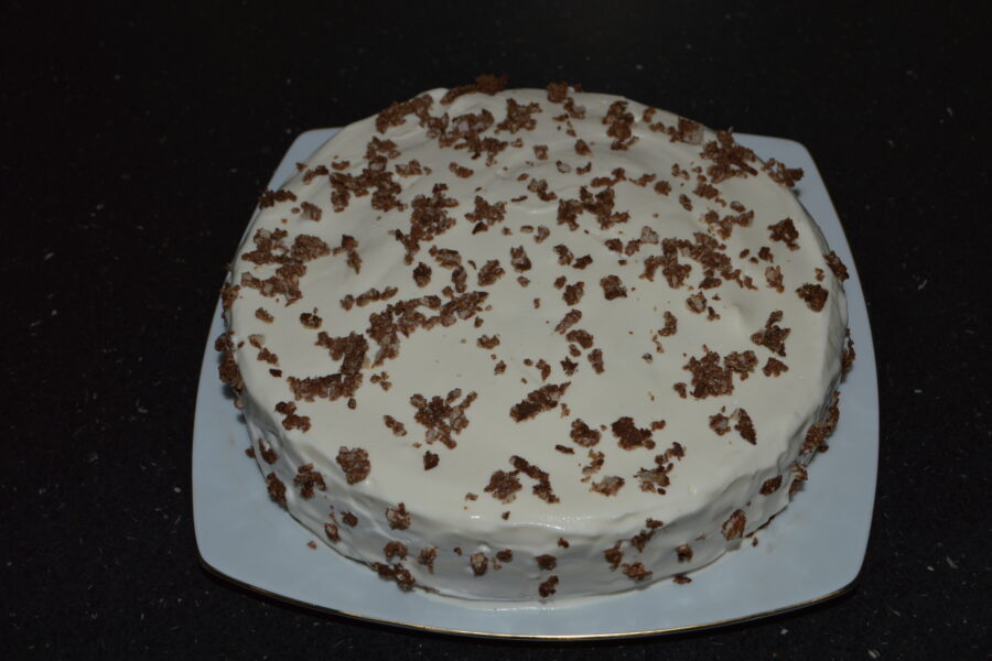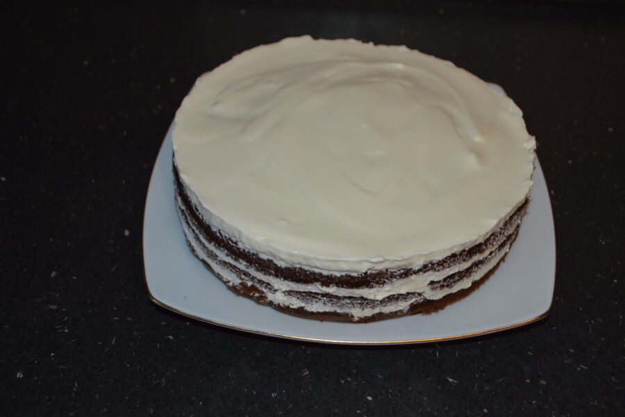 - Ungeti laturile cu crema ramasa, si cu ajutorul unui cutit neteziti si uniformizati tortul.