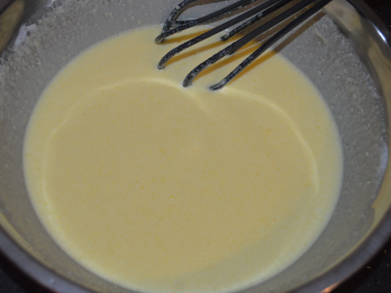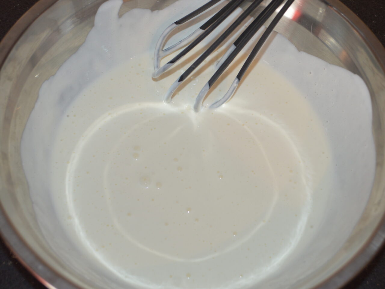 - Amestecati bine cu un tel, se vor face bule de aer, asta inseamna ca praful de copt reactioneaza cu smantana.