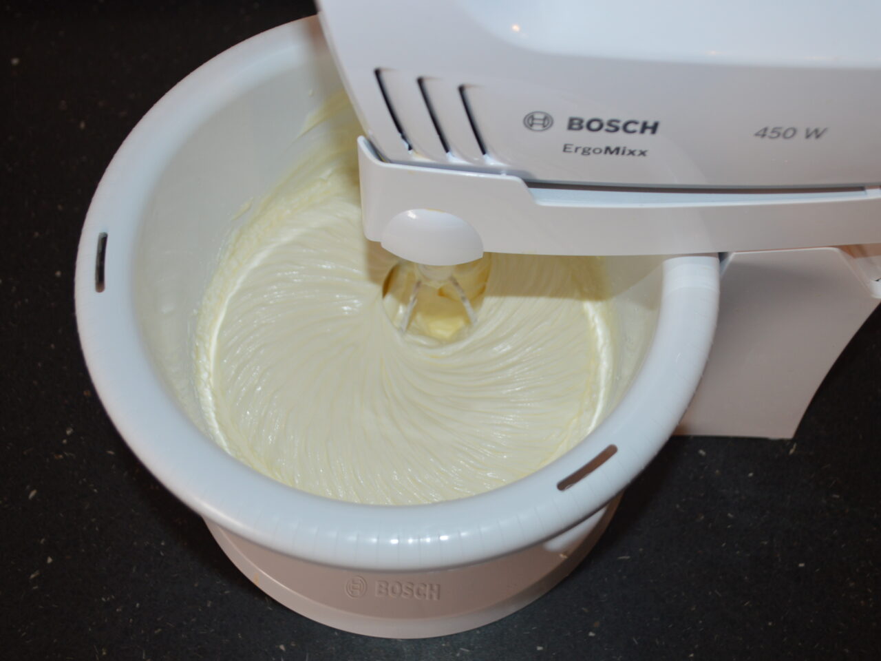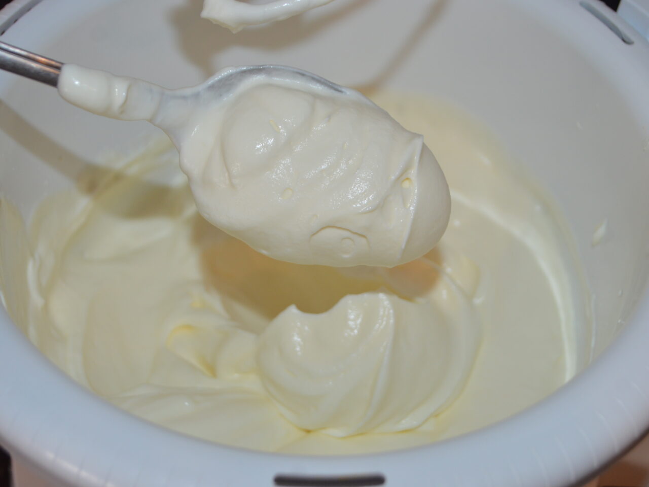 - Intre timp ne ocupam de crema, aveti nevoie de un mixer, puneti smantana si zaharul, si bateti mai intii la viteza mica un minut, apoi la viteza cea mai mare timp de 8-10 minute.