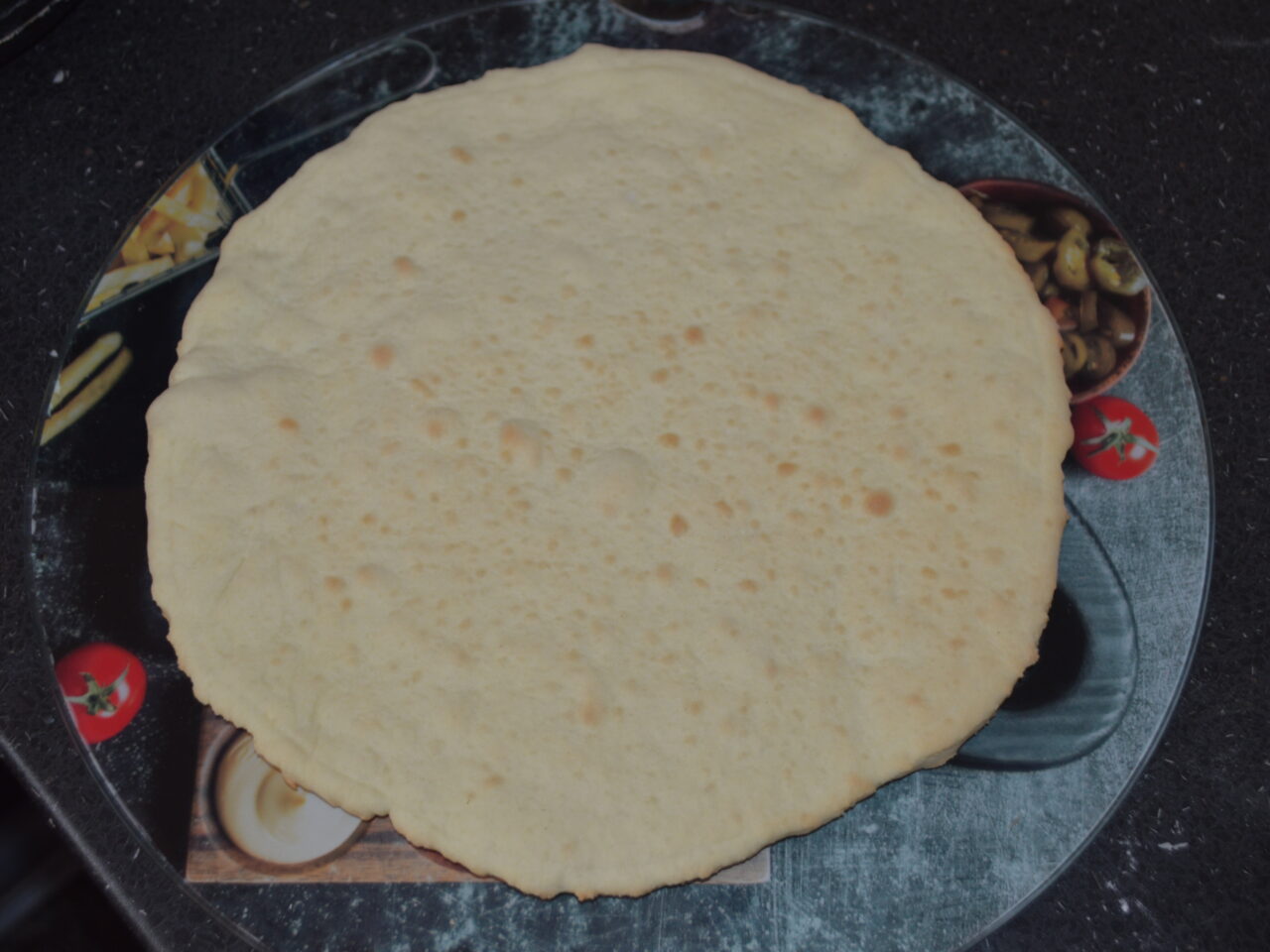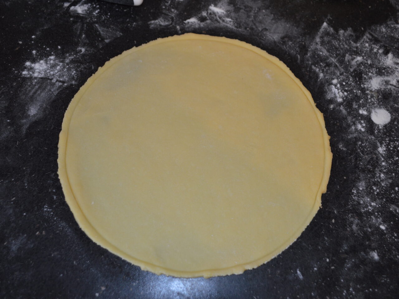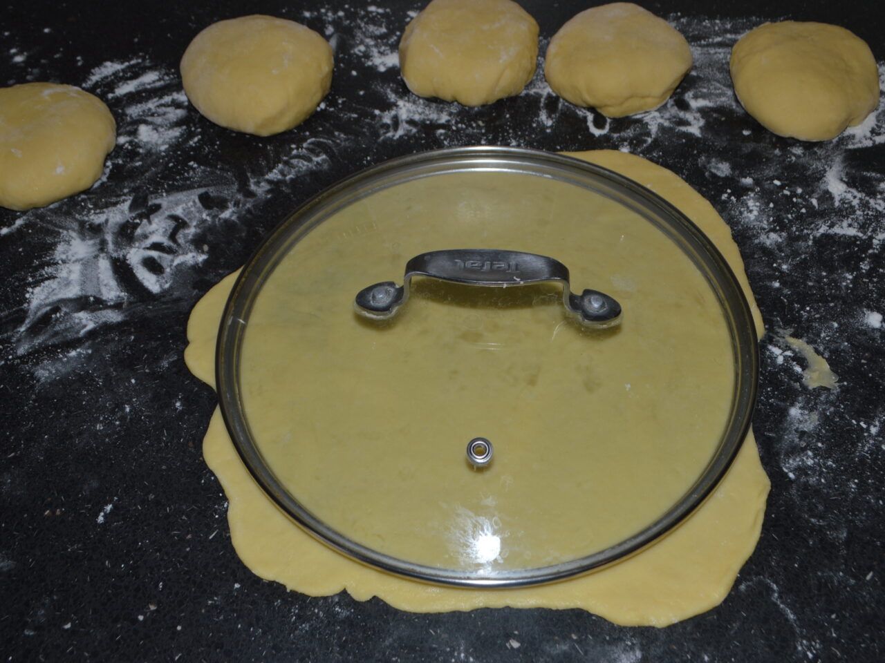 - Intindeti bilele de aluat cu facaletul, presurati dedesubt putina faina ca sa nu se lipeasca de masa, si folositi un capac sau o farfurie mare, rotunda pentru a forma un cerc.