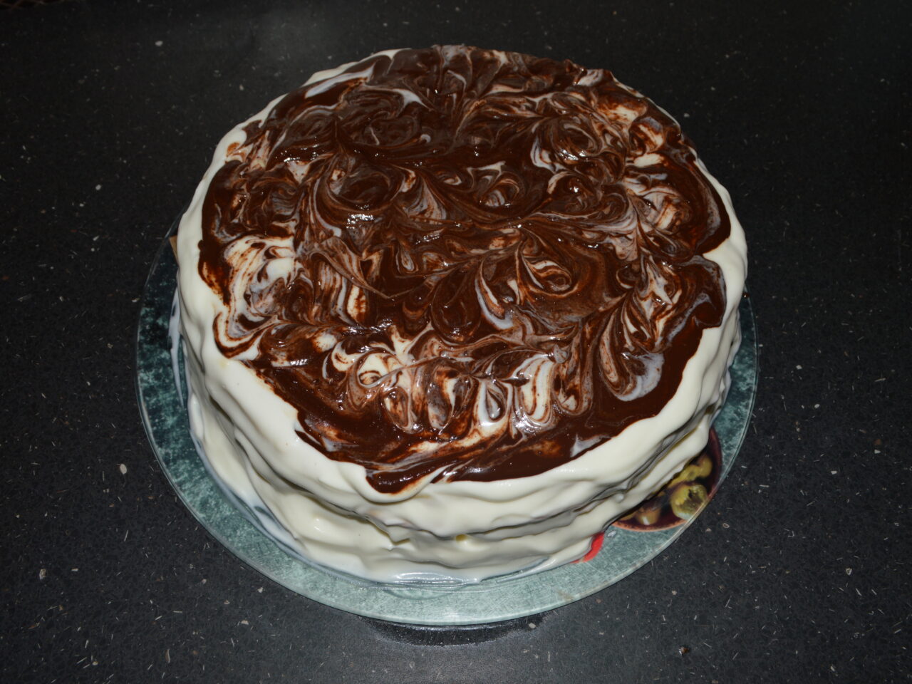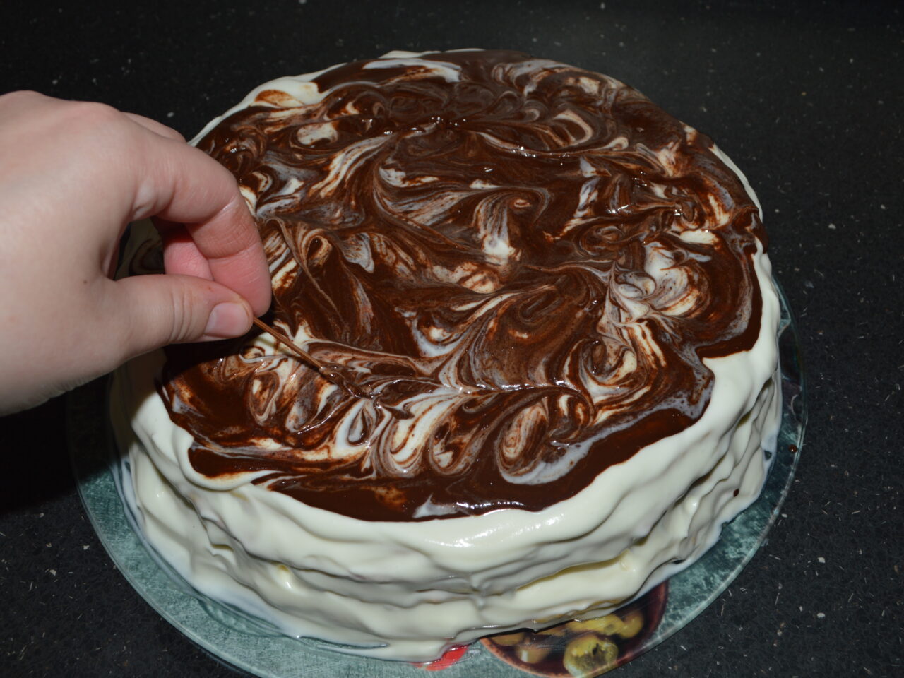 - Turnati glazura deasupra tortului si o uniformizati cu o lingura. Apoi cu ajutorul unei tepuse de lemn faceti niste cercuri mici, sau puteti decora cum doriti.