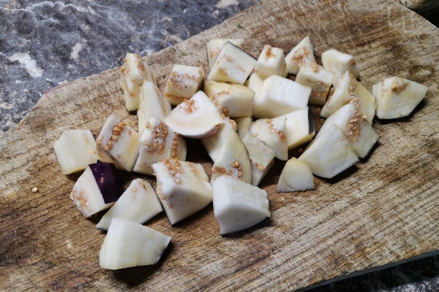- Spalati toate legumele. Taiati vinetele in felii de 2-3 cm grosime. Nu indepartati miezul si nu curatati pielea.