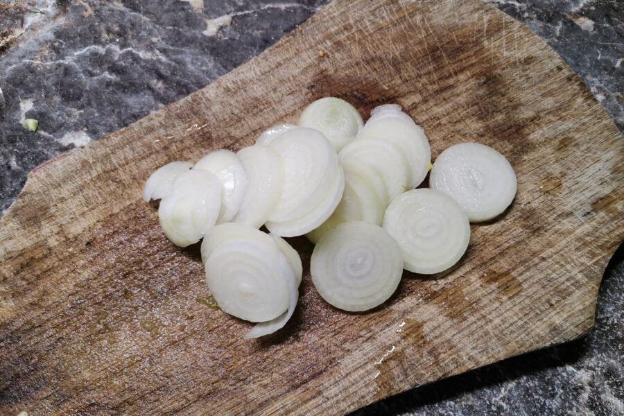 - Taiati ceapa in inele sau jumatati de inele.