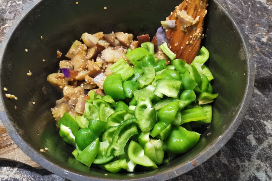 - Prajiti vinetele la foc mare in ulei vegetal timp de 5 minute. Adaugati ardeiul dulce si gatiti inca 3-4 minute.