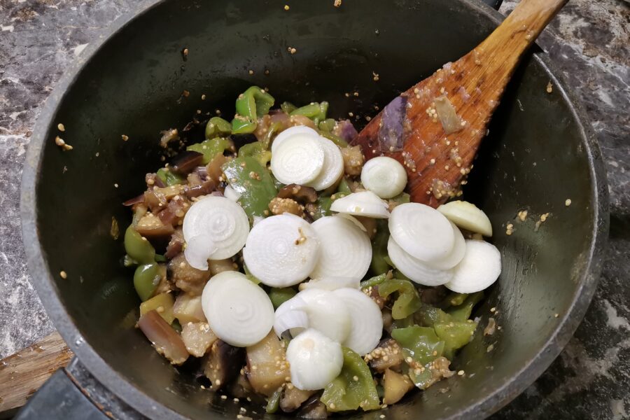 - Puneti ceapa, amestecati si opriti focul.