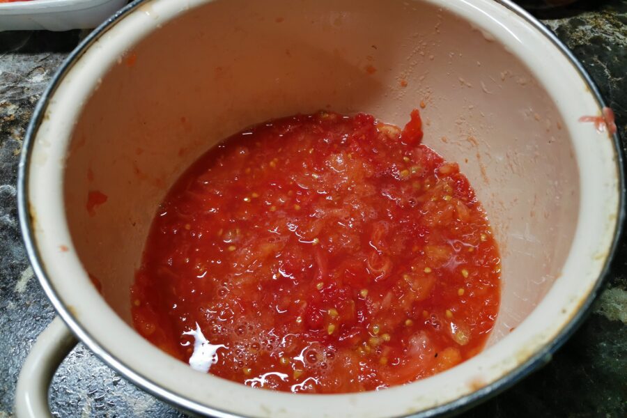 - Radeti 2-3 rosii sau tocati-le cu ajutorul unui blender. Adaugati sarea, zaharul si otetul.