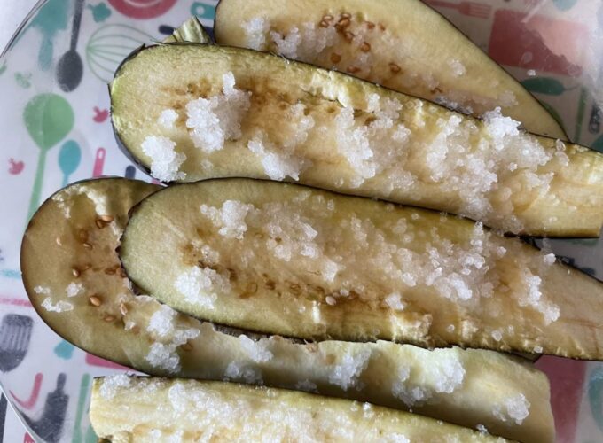 - Luați vinetele și tăiați-le în bucăți mari pe lungime, nu în cercuri. Sarati bine.