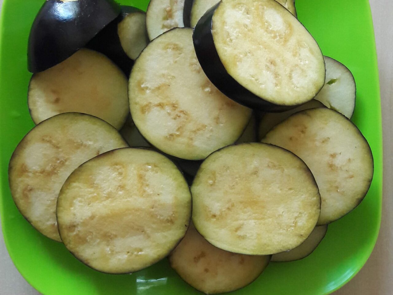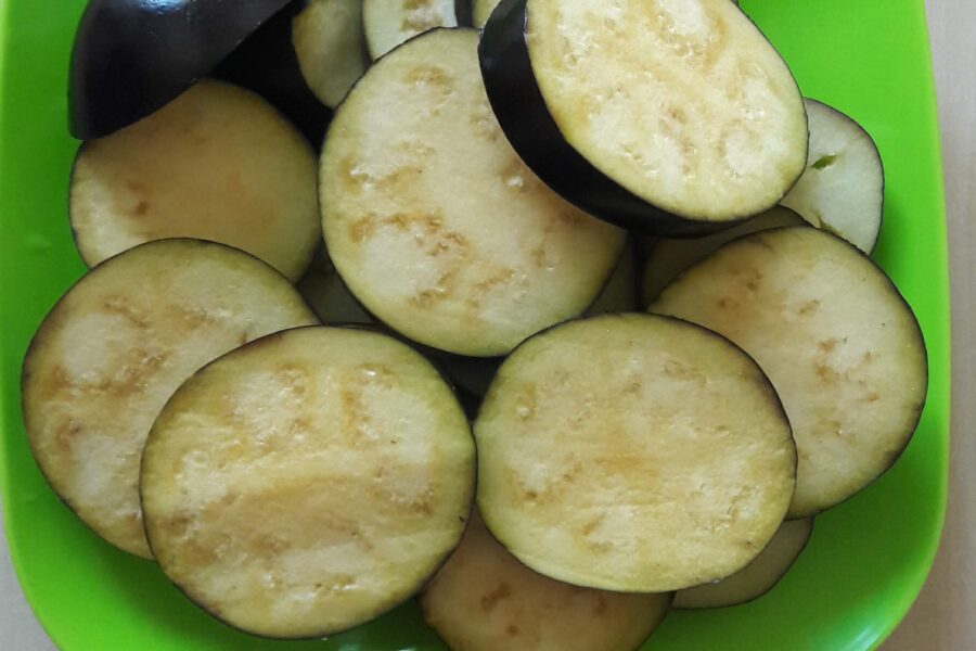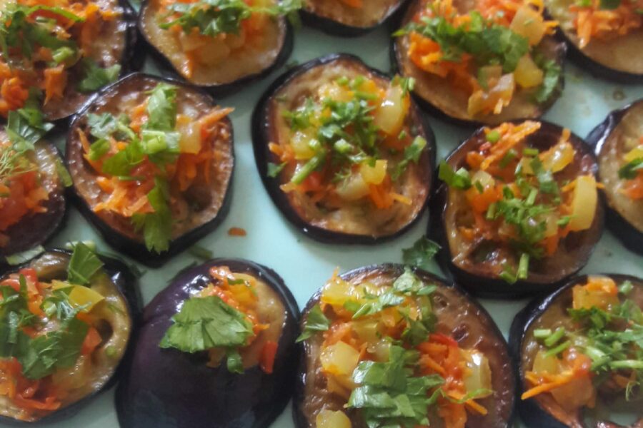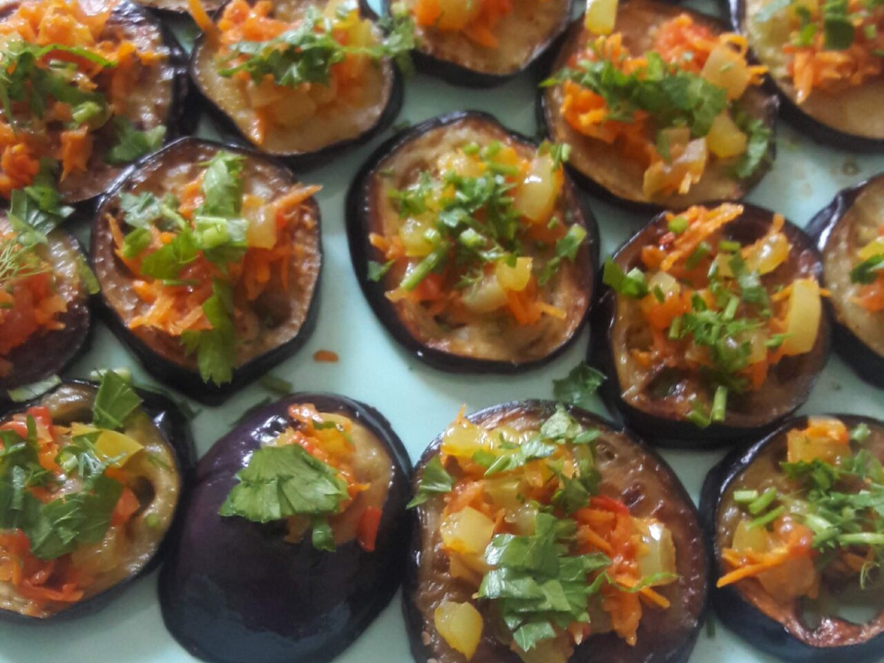 - Se pun legumele pe fiecare rondela de vinete si se presara verdeata deasupra.