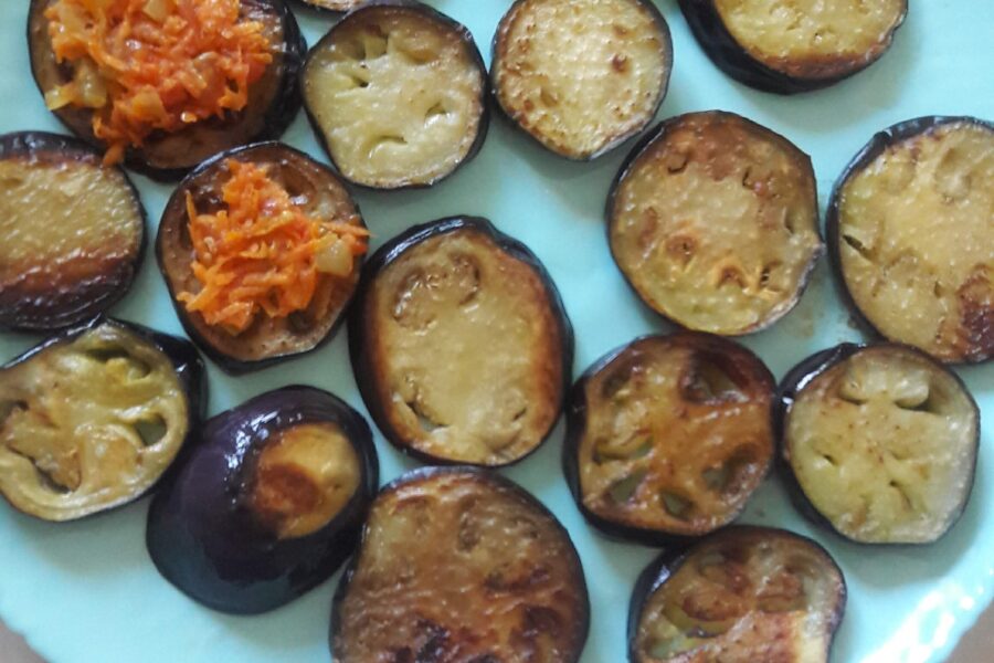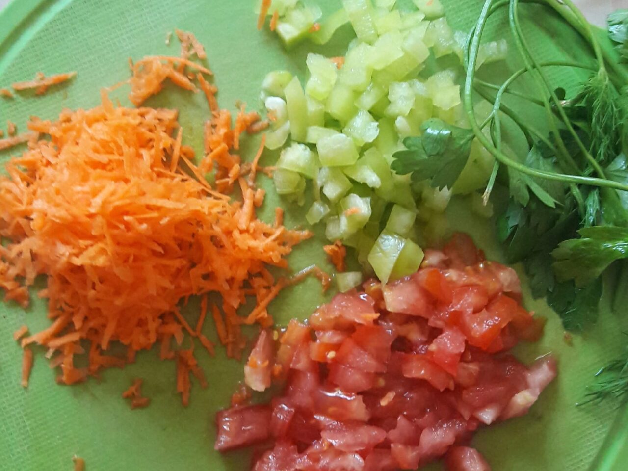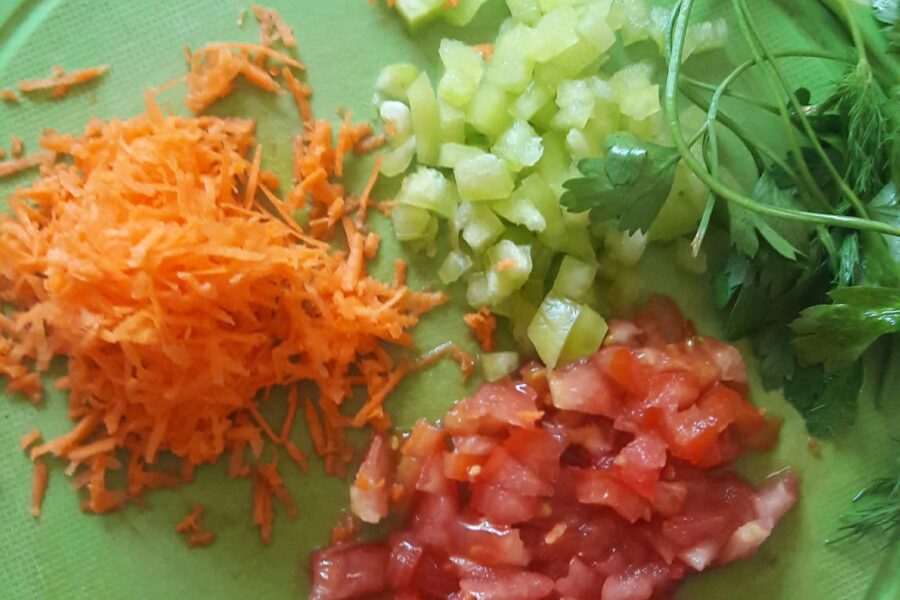 - Urmeaza prepararea restul legumelor. Rosiile si ardeiul dulce se taie cubulete mici, morcovul se rade fin, apoi toate legumele se gatesc in ulei vegetal pana sunt gata. Se pun pe farfurie, se adauga un catel de usturoi strivit, se amesteca.