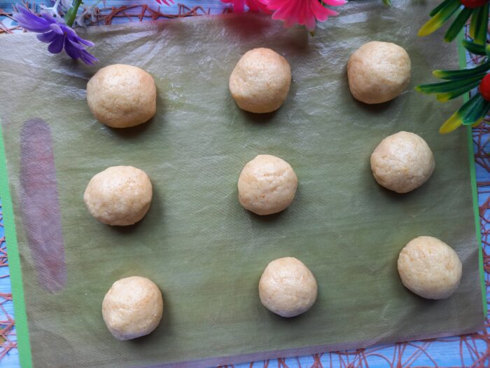 Se frământă din nou bine amestecul de griș. Aluatul de biscuiți nu trebuie să fie sfărâmicios. Dacă este necesar, mai adăugați puțin lichid (ulei sau apă). Ca urmare, dorim ca aluatul să fie ușor lipicios și foarte moale. Împărțiți-l în mai multe bucăți și tăvăliți-l în bile puțin mai mici decât o minge de tenis de plastic. Așezați bucățile pe o tavă de copt (eu am căptușit-o cu un covoraș de teflon) și puneți-le la cuptor pentru o treime de oră.