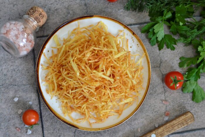 Se pune o mana mica de cartofi uscati, rasi, in ulei bine incins si se prajeste, amestecand. Se reduce focul la mediu si se gatesc pana cand incep sa se rumeneasca.