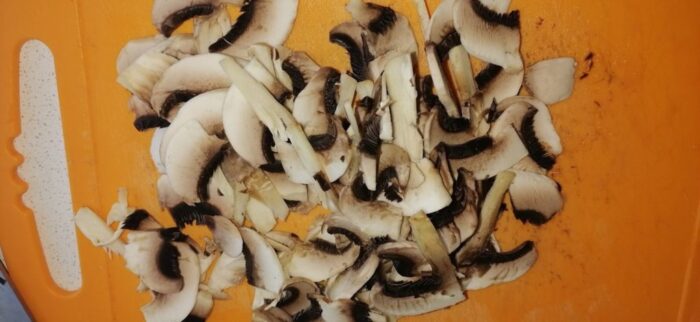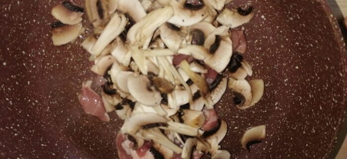 Se spală carnea, se taie în felii subțiri de orice formă. Se curăță ciupercile de coajă și se taie în felii