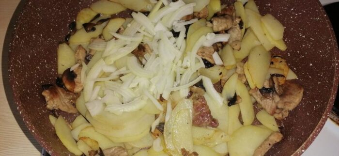 Se curăță cartofii de coajă, se taie felii, se pun într-o tigaie și se prăjesc până sunt aproape fierți, aproximativ 7 minute.
