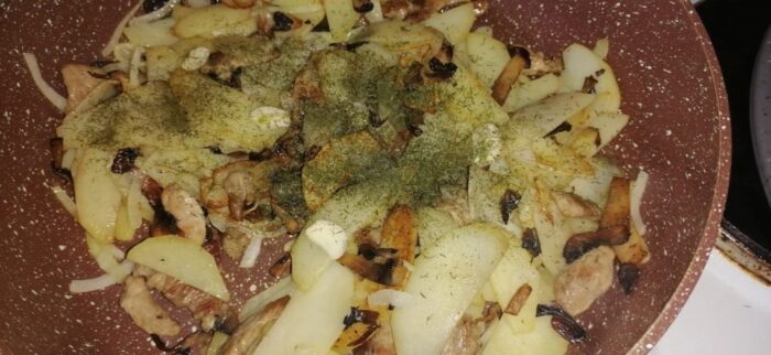 Se adaugă ceapa tăiată felii, se prăjește până când toate produsele sunt gata. Apoi se adaugă usturoiul tăiat în bucăți de orice formă, mărarul, sarea și piperul.
