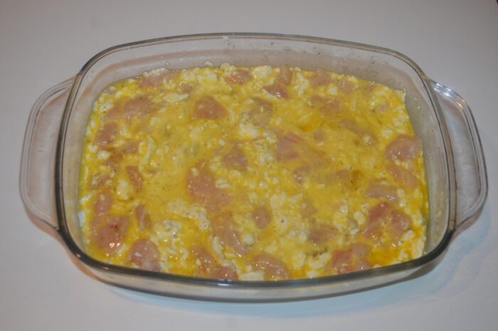 Taiati pieptul de pui marunt, si adaugati-l intr-o caserola de copt.