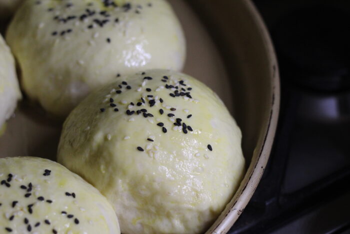 Se împarte aluatul în 8-10 bucăți. Greutatea aproximativă a unei bucăți este de 75-80 de grame. Se frământă fiecare bucată de aluat pentru a forma chifle rotunde. Se așază pe o tavă de copt, se acoperă cu un prosop și se lasă la crescut încă patruzeci de minute.