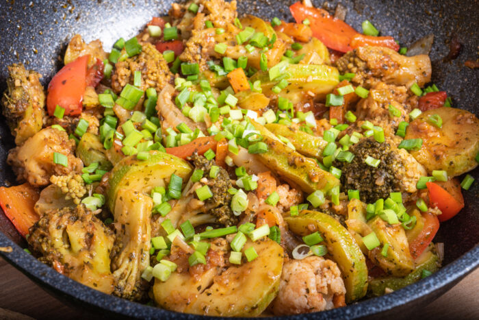 Unora le plac legumele crocante, în timp ce altora le plac moi. Deci, gradul de pregătire depinde de dvs. La urma urmei, legumele nu sunt carne. La servire, legumele pot fi stropite cu ceapă verde.