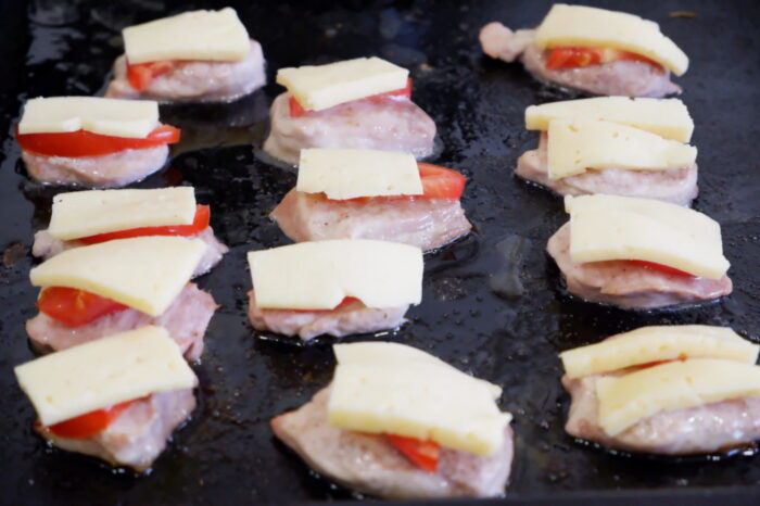 Tăiați roșia felii și puneți bucățile pe medalioane de porc. Dacă se dorește, roșiile pot fi acoperite cu maioneză.