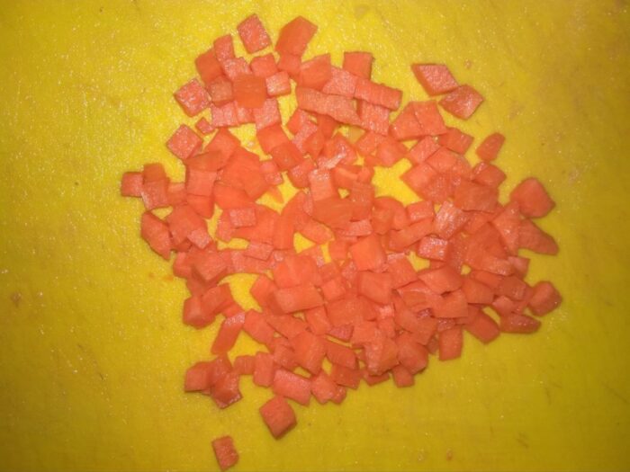 În timp ce ficatul se gătește, curățați ceapa și morcovii. Tăiați morcovii în pătrate mici și, de asemenea, toacă mărunt ceapa.