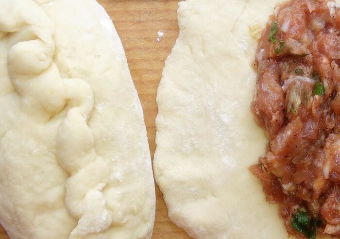 Se amestecă bine tocătura și se lasă la frigider. În ultima etapă, se frământă din nou aluatul fraged, se împarte în bucăți egale, se întinde cu ajutorul unui rulou de lemn sau de plastic un strat rotund și relativ uniform (aproximativ 15 cm în diametru), se așază carnea în centru și se închid bine marginile.