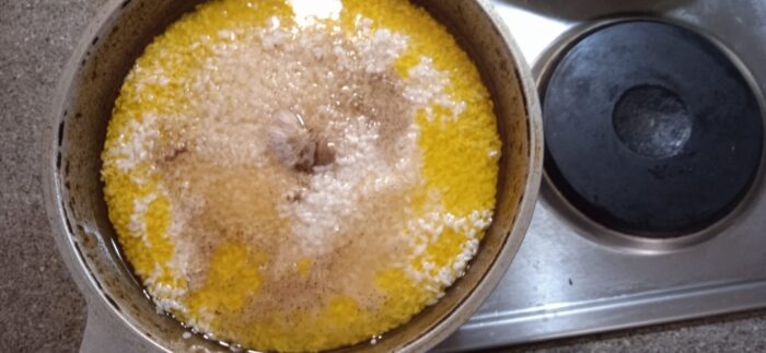Acum aplicati toate condimentele si adaugati orezul. Stoarceti un cap intreg de usturoi in mijlocul orezului. Necurăţat. Il spalati doar. Nivelați cu grijă orezul și uitați-vă la câtă apă este în ceaun. Apa trebuie să acopere orezul cu 1 centimetru. Completați dacă este necesar. Aduceți conținutul la fierbere la foc mare și reduceți imediat focul la setarea cea mai scăzută.