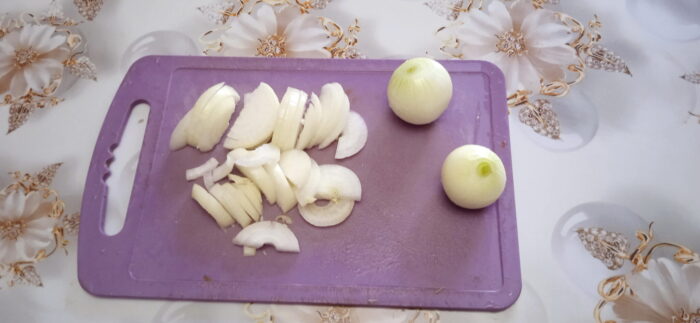 Acum este rândul cepei și morcovilor. Tăiați ceapa în jumătate de rondele.