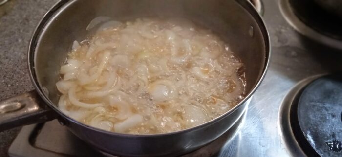 Apoi adaugati ceapa si morcovii. Dacă este necesar, adăugați apă. Apa ar trebui să acopere conținutul cu doi centimetri. Gustam apa pentru sare. Conținutul de sare ar trebui să fie puțin mai mare decât cel al bulionului obișnuit. Orezul va elimina excesul de sare. Îi place sarea.
