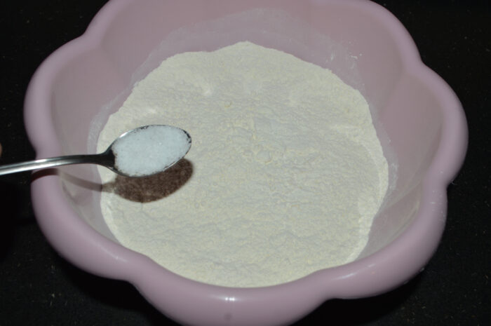 Intre timp, pregatiti aluatul. Turnati faina intr-un bol, si adaugati o lingurita de sare.