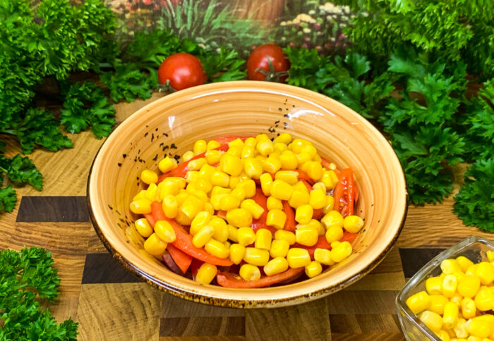 Scurgeti lichidul din porumb, si clatiti-l cu apa curenta. Adaugati porumbul in farfurie.