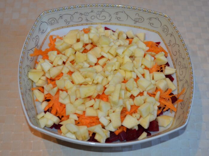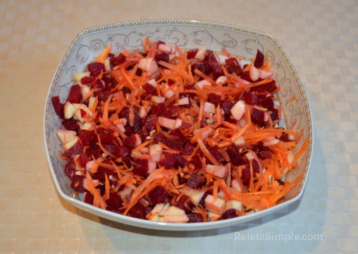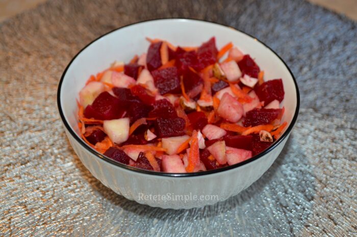 Fierbeti sfecla cu coaja, o lasati sa se raceasca apoi o curatiti si o taiati cubulete. Adaugati sfecla taiata intr-un bol adanc pentru salata.