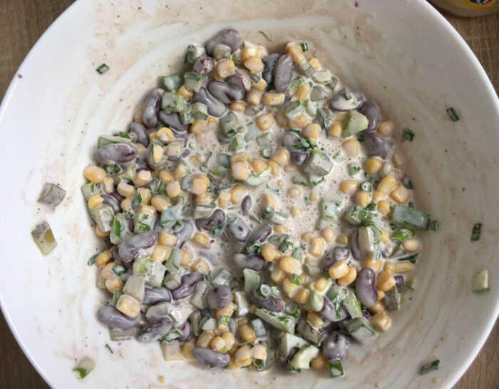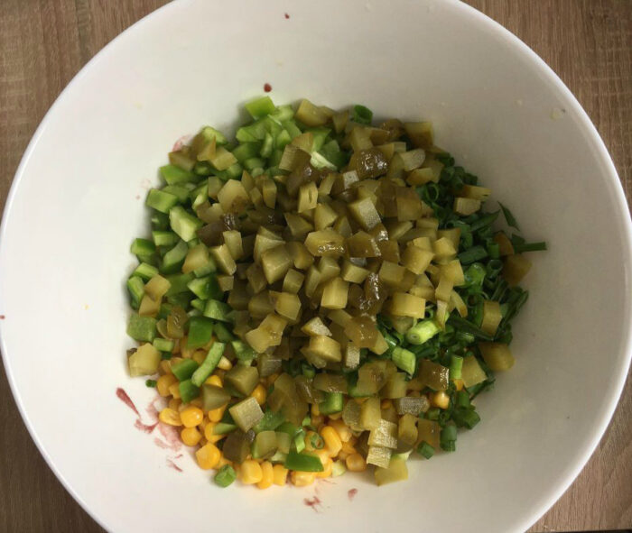 Tăiați ardeiul și castravetele în cuburi destul de mici, tăiați ceapa. Puneti fasolea scursă și porumbul într-un castron mare.
