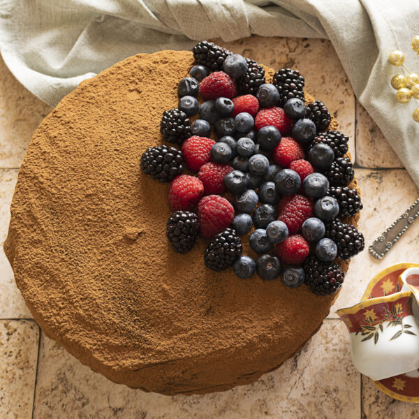 Puteți să o decorați cu fructe de pădure proaspete roșii și întunecate. Acestea arată frumos pe suprafața sa catifelată de ciocolată.