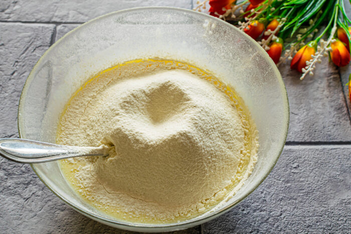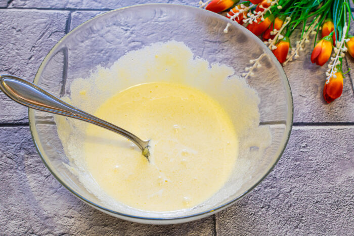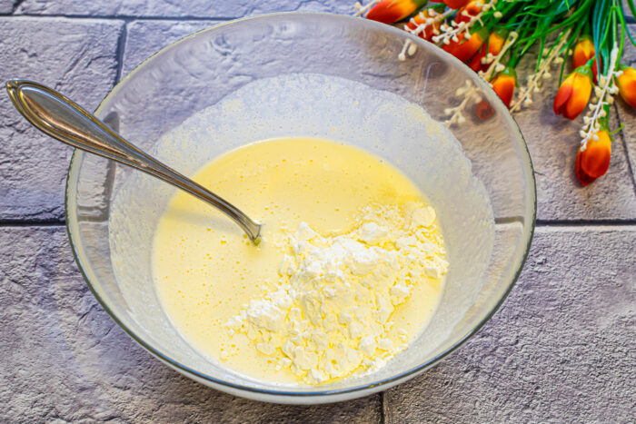 Într-un alt castron, se bat 3 ouă, se adaugă laptele condensat, se amestecă.