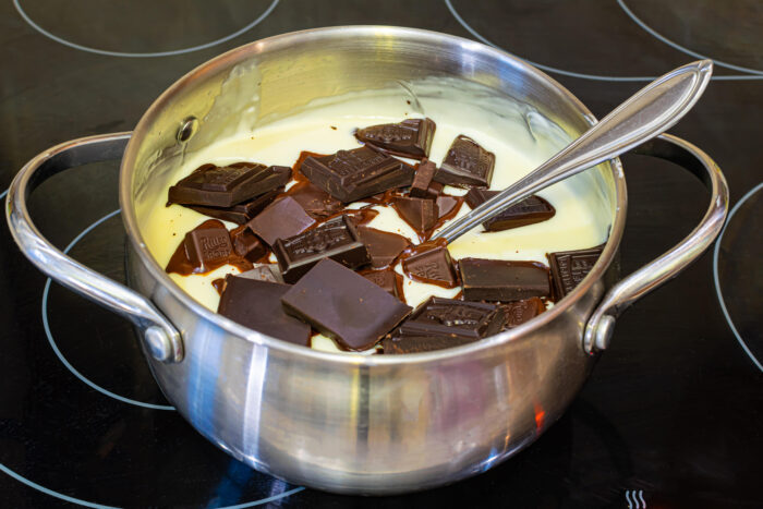 După ce crema s-a îngroșat, se oprește focul și se adaugă imediat ciocolata ruptă în bucăți.