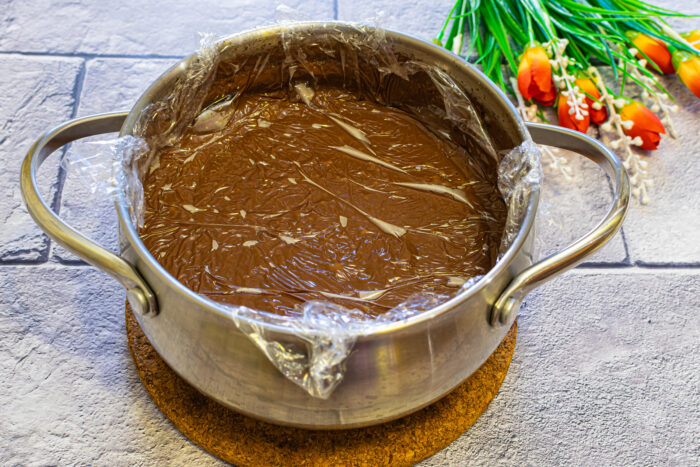 Se amestecă până când ciocolata se dizolvă complet, apoi se bate bine cu un mixer. Se acoperă suprafața cremei cu folie alimentară și se lasă la răcit.