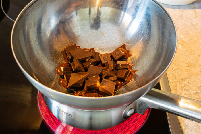 Pentru a face aluatul, mai întâi se topește ciocolata într-un castron de metal pe o baie de apă cu apă care fierbe încet.