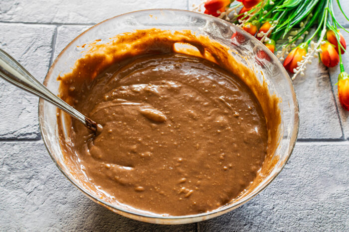 Apoi se adaugă făina cernută, sarea, praful de copt și ciocolata topită.