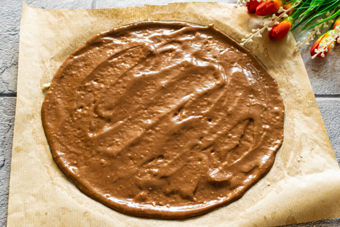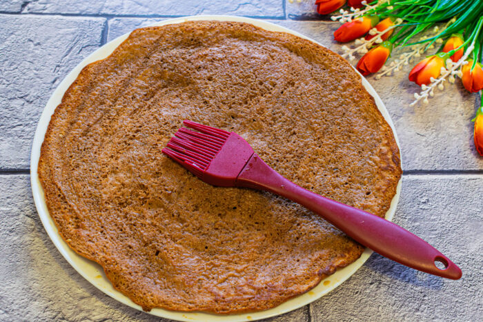 Se taie pătrate din hârtia de pergament, se desenează cercuri pe spatele hârtiei de pergament cu un creion simplu, în formă cu un diametru de 20-24 cm. Întoarceți hârtia pergament pe partea cealaltă și ungeți cu bucăți de unt. Întindeți aluatul în porții de aproximativ 2 linguri fiecare. Se întinde aluatul uniform în cerc, în strat foarte subțire, formând prăjituri după forma desenată, 7-9 bucăți.