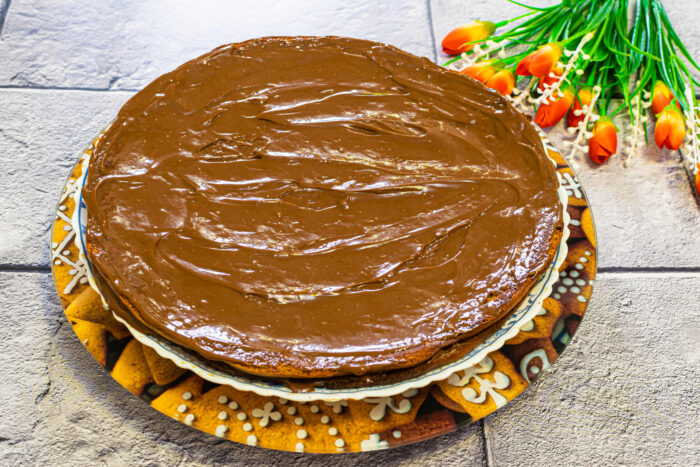 Se asamblează tortul, întinzând o cantitate generoasă de cremă pe fiecare tort. Este foarte multă cremă, așa că puteți întinde multă cremă. Este convenabil să faceți acest lucru pe un suport de tort rotativ. Acoperiți cu cremă partea de sus și părțile laterale ale tortului.