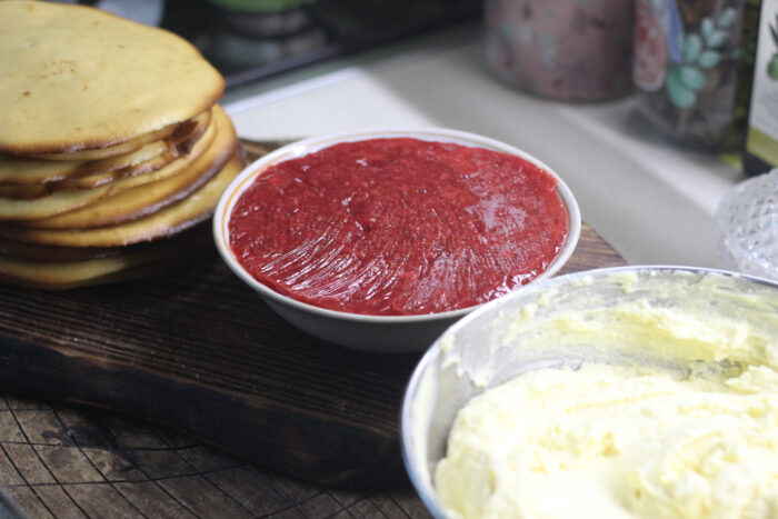 Se asamblează tortul ungând prăjiturile cu crema. Adăugați un strat de fructe de pădure confiate peste tort. Trimiteți tortul format la rece peste noapte.