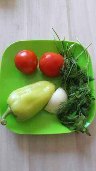 Urmeaza prepararea restul legumelor. Rosiile si ardeiul dulce se taie cubulete mici, morcovul se rade fin, apoi toate legumele se gatesc in ulei vegetal pana sunt gata. Se pun pe farfurie, se adauga un catel de usturoi strivit, se amesteca.